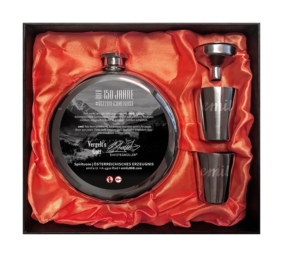 Das emil Flachmann Set als limited Edition besteht aus einem besonders schön designten Flachmann inkl. zwei Becker plus Einfülltrichter. Damit kommt dieser angesetzte Zirben Schnaps von emil-Spirituosen noch besser zur Geltung und eignet sich als tolles Geschenk. Ab in den Rucksack und ab auf Wanderschaft!